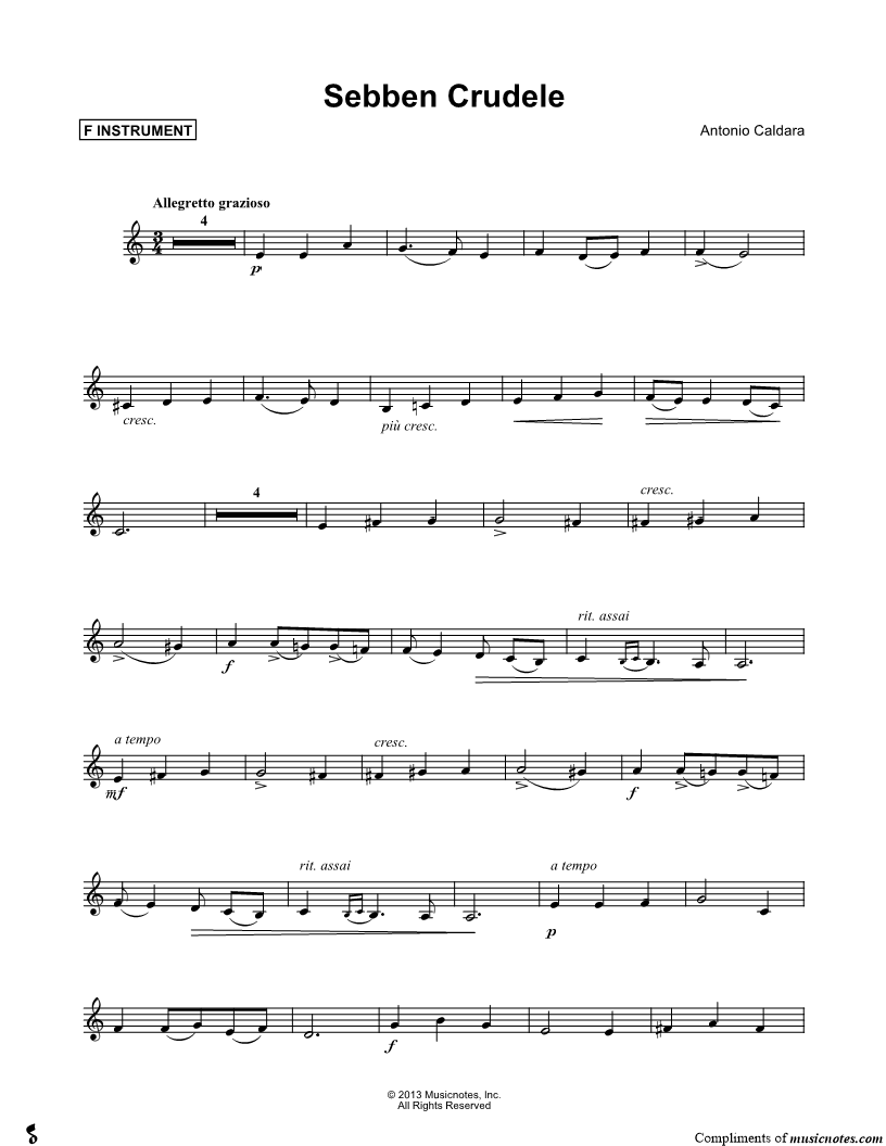 1. Sebben Crudele - F Instrument (click here to preview and play this piece) Composer: Scored For:Instrumental Part and Instrumental Solo Instrument:F Instrument, range: A3-B4 Number of pages:2 Click here to purchase this piece separately for $4.99 |