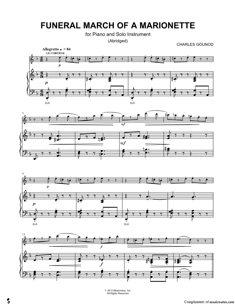 1. Funeral March of a Marionette - Piano Accompaniment (click here to preview and play this piece) Composer: Scored For:Solo & Accompaniment and Instrumental Part Instruments:Piano Accompaniment, C Instrument, range: B4-E6, Violin, Oboe, Flute and Recorder Number of pages:2 Click here to purchase this piece separately for $5.99 |