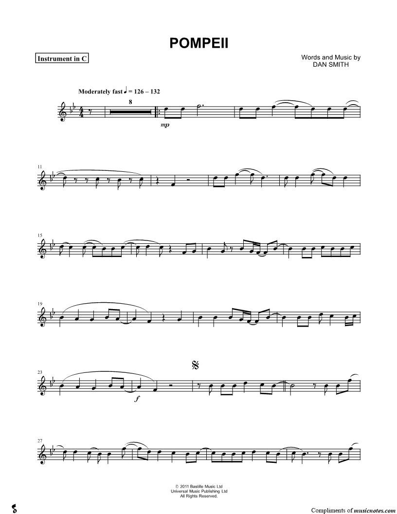 1. Pompeii - C Instrument (click here to preview and play this piece) Performer: Composer: Lyricist: Scored For:Instrumental Solo and Instrumental Part Instruments:C Instrument, range: F4-G5, Violin, Oboe, Flute and Recorder Number of pages:2 Click here to purchase this piece separately for $4.99 |