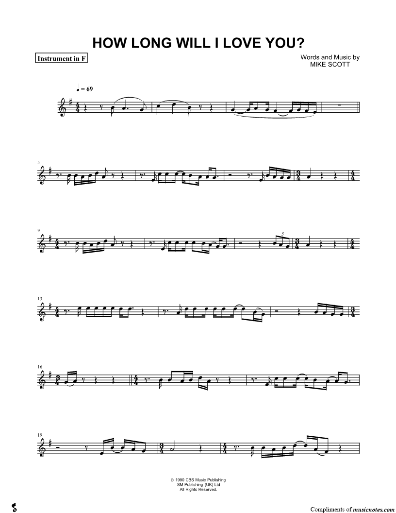 1. How Long Will I Love You - F Instrument (click here to preview and play this piece) Performer: Composer: Lyricist: Scored For:Instrumental Solo and Instrumental Part Instrument:F Instrument, range: D4-E5 Number of pages:2 Click here to purchase this piece separately for $4.99 |