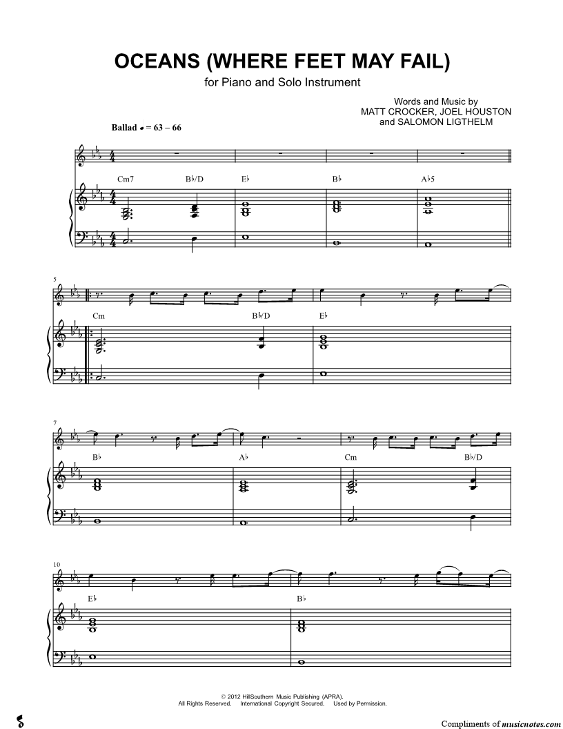 1. Oceans (Where Feet May Fail) - Piano Accompaniment (click here to preview and play this piece) Performer: Composers: Lyricists: Scored For:Solo & Accompaniment and Instrumental Part Instruments:Piano Accompaniment, C Instrument, range: Bb4-Eb6, Violin, Oboe, Flute and Recorder Number of pages:9 Click here to purchase this piece separately for $5.99 |