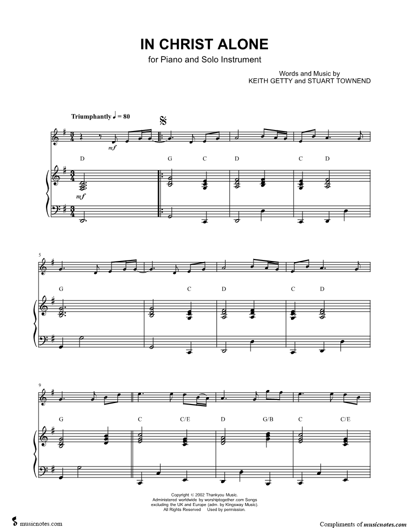 1. In Christ Alone - Piano Accompaniment (click here to preview and play this piece) Performer: Composers: Lyricists: Scored For:Solo & Accompaniment Instruments:Piano, C Instrument, range: D4-A5, Violin, Oboe, Flute and Recorder Number of pages:4 Click here to purchase this piece separately for $5.99 |