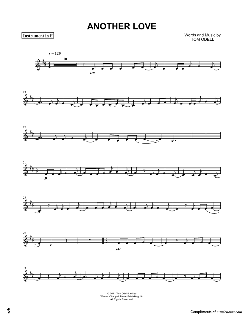 1. Another Love - F Instrument (click here to preview and play this piece) Performer: Composer: Lyricist: Scored For:Instrumental Part and Instrumental Solo Instrument:F Instrument, range: A3-E5 Number of pages:3 Click here to purchase this piece separately for $4.99 |