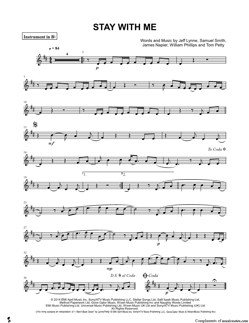 1. Stay with Me - Bb Instrument (click here to preview and play this piece) Performer: Composers: Lyricists: Scored For:Instrumental Solo and Instrumental Part Instruments:Bb Instrument, range: D4-F#5, Trumpet, Soprano Saxophone, Tenor Saxophone and Clarinet Number of pages:1 Click here to purchase this piece separately for $4.99 |