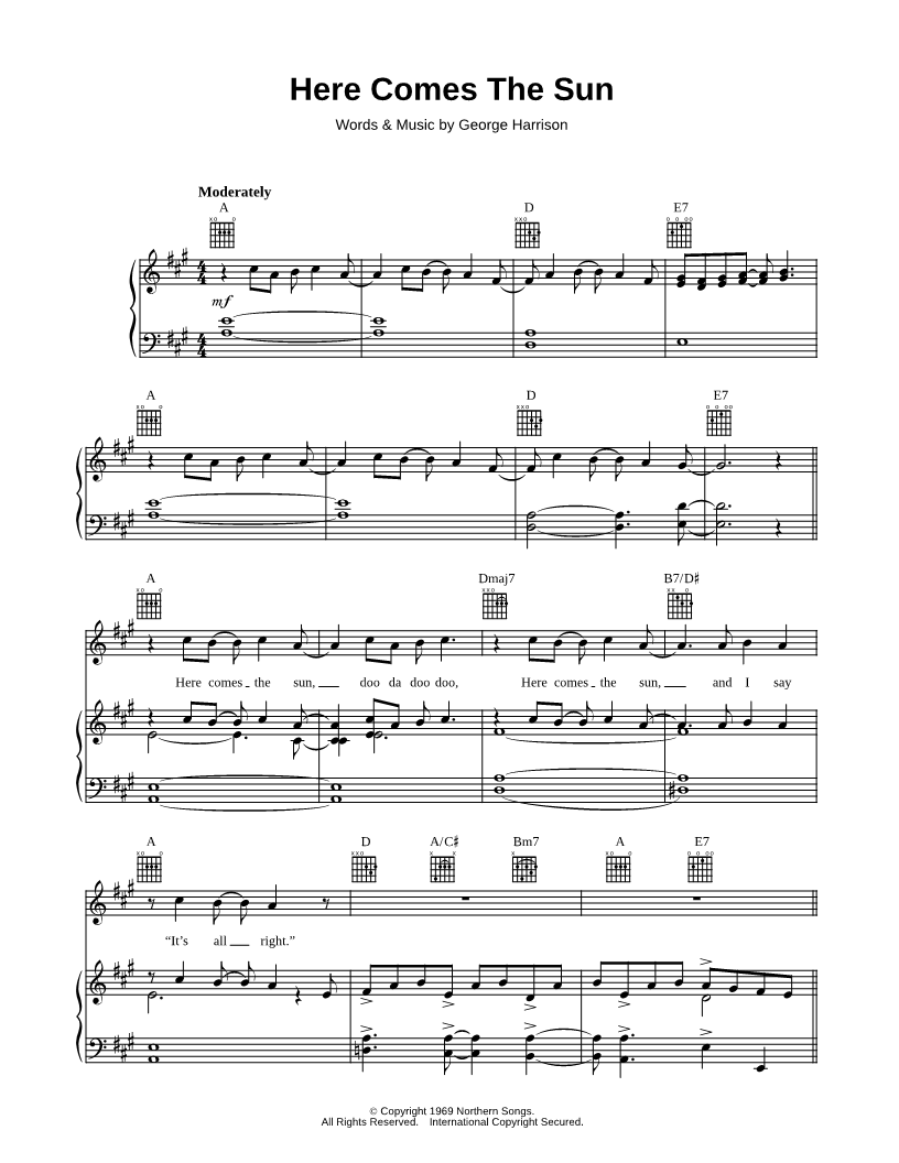 1. Here Comes the Sun (click here to preview and play this piece) Performer: Composer: Lyricist: Scored For:Piano/Vocal/Guitar Instruments:Voice, range: E4-C#5, Piano and Guitar Number of pages:4 Click here to purchase this piece separately for $5.99 |
