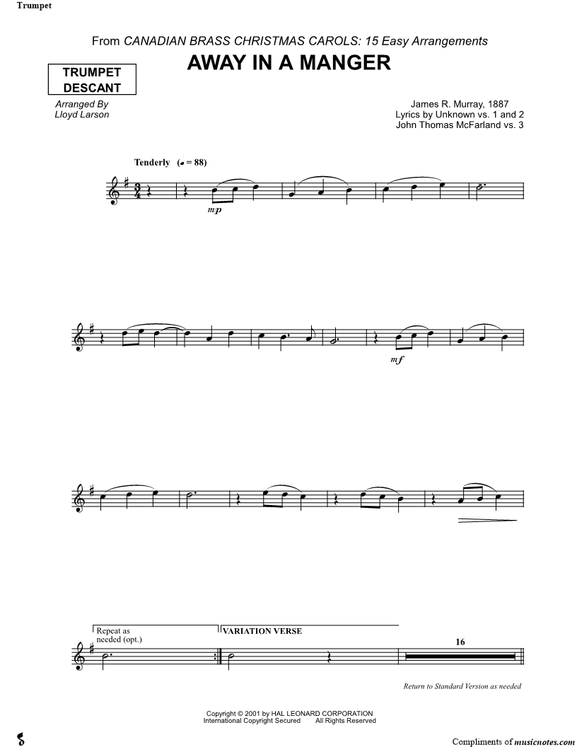 2. Away in a Manger - Trumpet 1 (Brass Quintet) (click here to preview and play this piece) Performer: Composer: Lyricist: Scored For:Instrumental Part Instrument:Trumpet 1, range: D4-G5 Number of pages:1 Click here to purchase this piece separately for $4.99 |