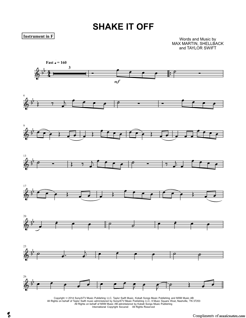 1. Shake It Off - F Instrument (click here to preview and play this piece) Performer: Composers: Lyricists: Scored For:Instrumental Part and Instrumental Solo Instrument:F Instrument, range: Bb3-F5 Number of pages:3 Click here to purchase this piece separately for $4.99 |