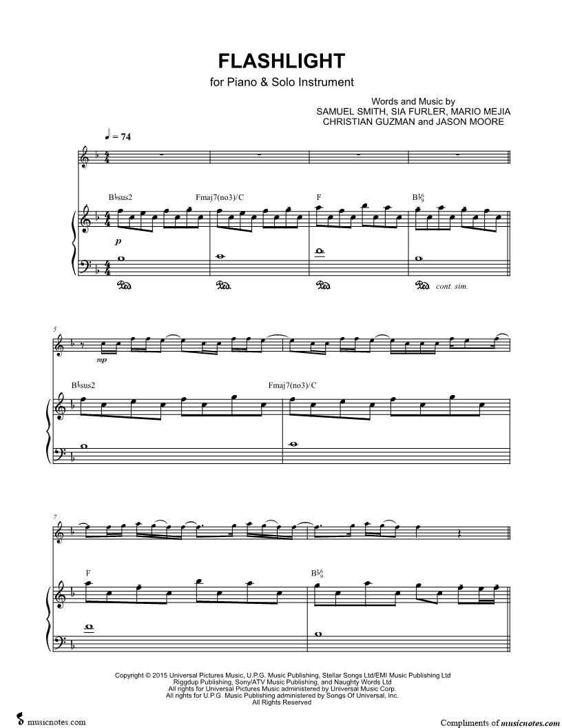 1. Flashlight - Piano Accompaniment (click here to preview and play this piece) Performer: Composers: Lyricists: Scored For:Solo & Accompaniment and Instrumental Part Instruments:Piano Accompaniment and Treble Clef Instrument Number of pages:5 Click here to purchase this piece separately for $5.99 |