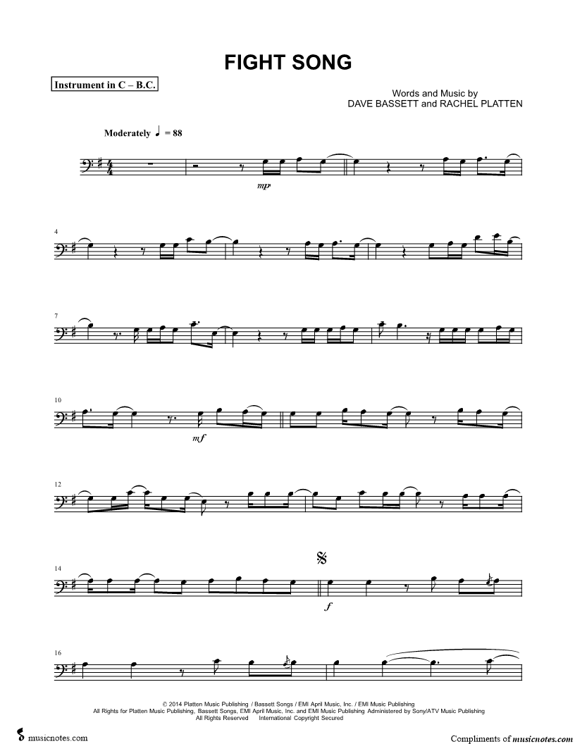 1. Fight Song - Bass Clef Instrument (click here to preview and play this piece) Performer: Composers: Lyricists: Scored For:Instrumental Part and Instrumental Solo Instruments:Bass Clef Instrument, range: G2-E4, Cello, Double Bass, Trombone, Bassoon and Baritone Horn or Euphonium Number of pages:3 Click here to purchase this piece separately for $4.99 |