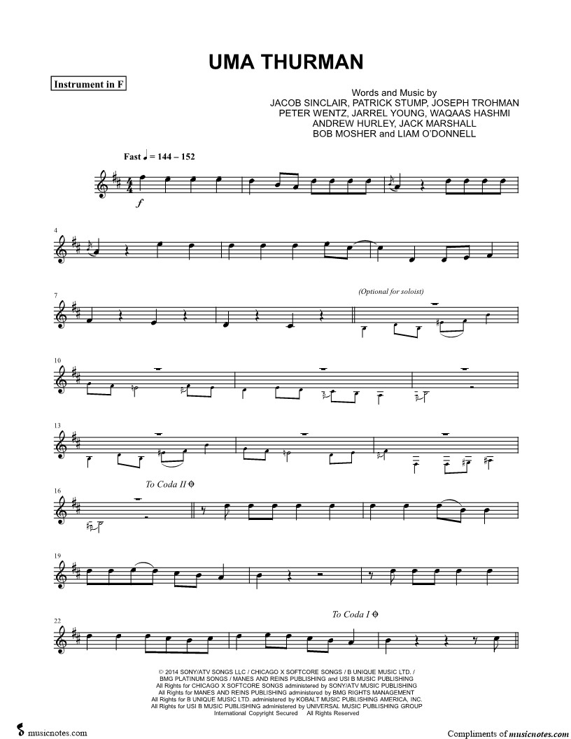 1. Uma Thurman - F Instrument (click here to preview and play this piece) Performer: Composers: Lyricists: Scored For:Instrumental Part and Instrumental Solo Instruments:F Instrument, range: C#4-F#5 and French Horn Number of pages:3 Click here to purchase this piece separately for $4.99 |