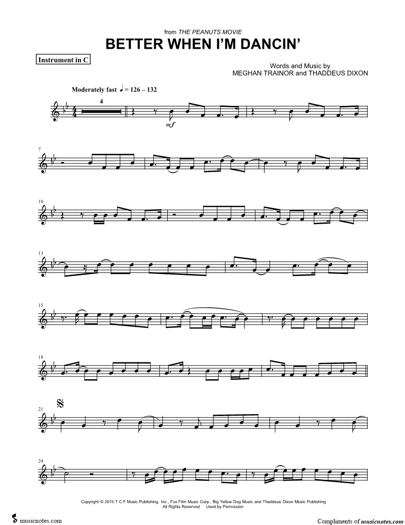 1. Better When I'm Dancin' - C Instrument (click here to preview and play this piece) Performer: Composers: Lyricists: Scored For:Instrumental Part and Instrumental Solo Instruments:C Instrument, range: Eb4-Bb5, Flute, Oboe, Violin and Recorder Number of pages:3 Click here to purchase this piece separately for $4.99 |