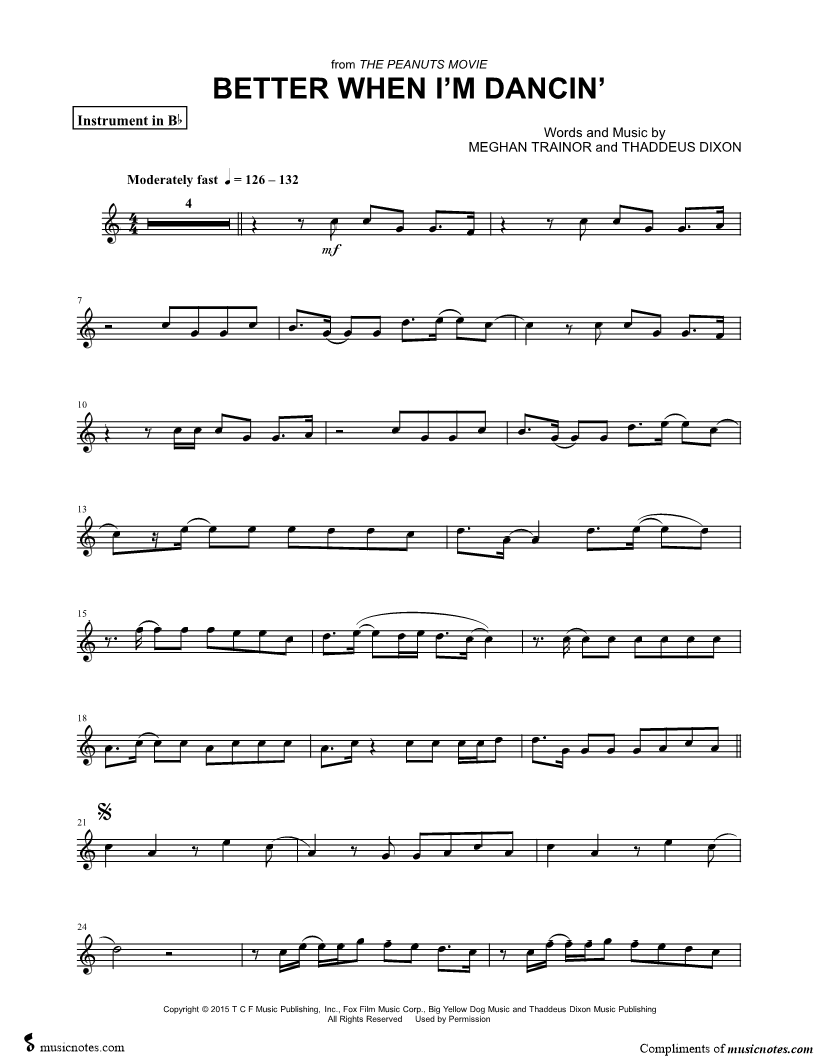 1. Better When I'm Dancin' - Bb Instrument (click here to preview and play this piece) Performer: Composers: Lyricists: Scored For:Instrumental Part and Instrumental Solo Instruments:Baritone Horn or Euphonium, Bb Instrument, range: F4-C6, Tenor Saxophone, Trumpet, Clarinet and Soprano Saxophone Number of pages:3 Click here to purchase this piece separately for $4.99 |