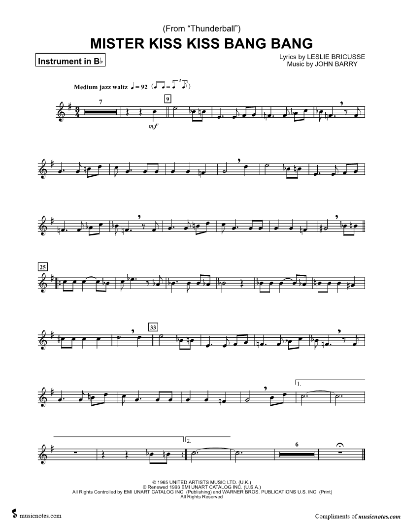 1. Mister Kiss Kiss Bang Bang - Bb Instrument (click here to preview and play this piece) Performers: Composer: Lyricist: Scored For:Instrumental Part and Instrumental Solo Instruments:Baritone Horn or Euphonium, Bb Instrument, range: E4-E5, Clarinet, Trumpet, Soprano Saxophone and Tenor Saxophone Number of pages:1 Click here to purchase this piece separately for $4.99 |