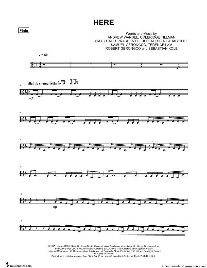 1. Here - Viola (click here to preview and play this piece) Performer: Composers: Lyricists: Scored For:Instrumental Part and Instrumental Solo Instrument:Viola, range: C3-Bb3 Number of pages:2 Click here to purchase this piece separately for $4.99 |