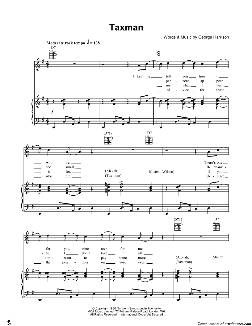 1. Taxman (click here to preview and play this piece) Performer: Composer: Lyricist: Scored For:Piano/Vocal/Guitar Instruments:Voice, range: G4-A5, Piano, Guitar and Backup Vocals Number of pages:3 Click here to purchase this piece separately for $5.99 |
