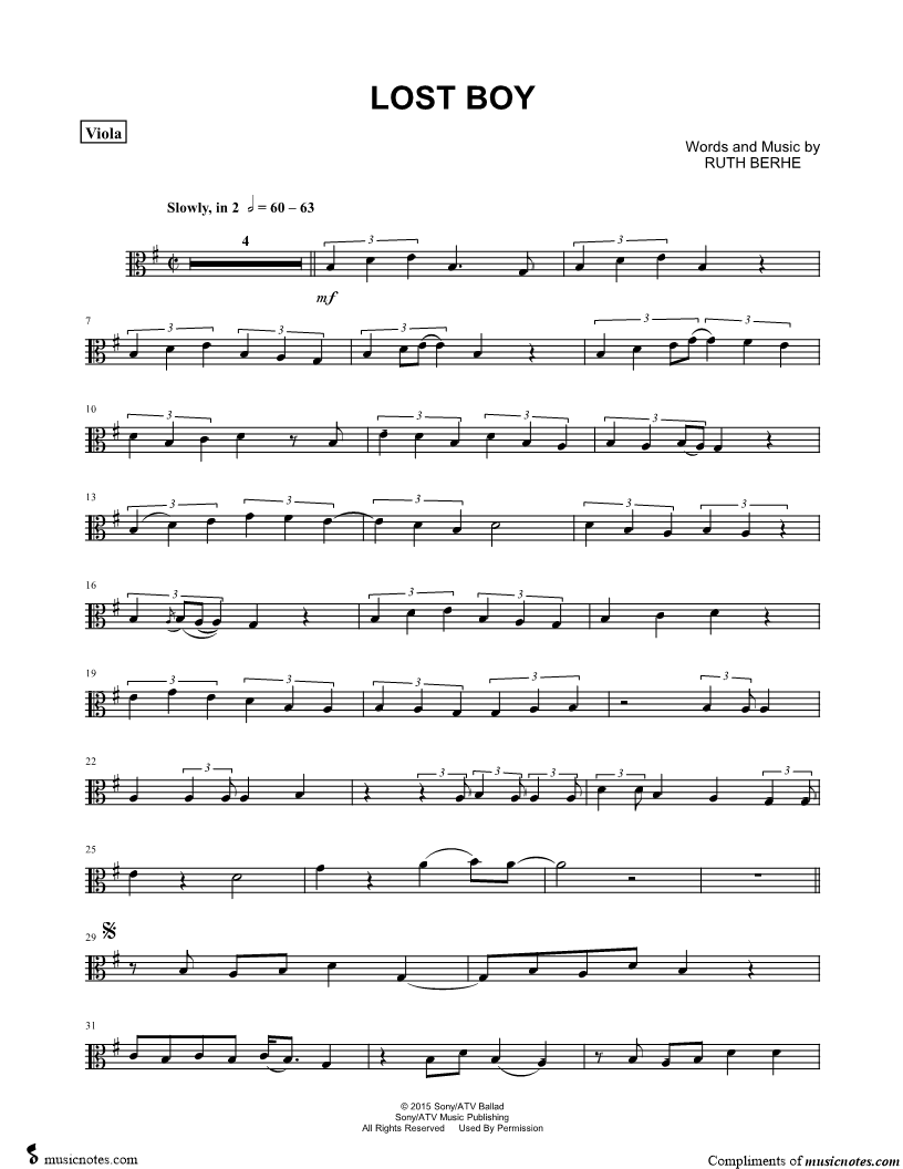 1. Lost Boy - Viola (click here to preview and play this piece) Performer: Composer: Lyricist: Scored For:Instrumental Part and Instrumental Solo Instrument:Viola, range: F#3-B4 Number of pages:3 Click here to purchase this piece separately for $4.99 |