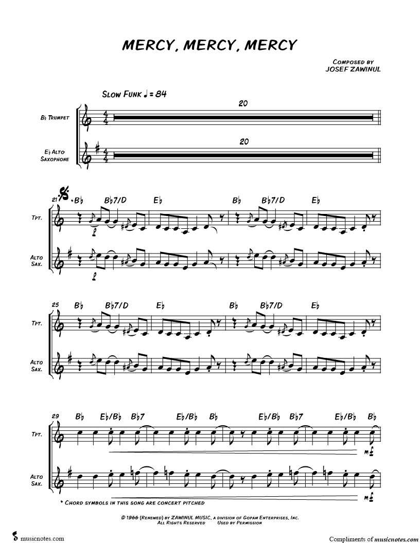 1. Mercy, Mercy, Mercy - Horn Section Score (click here to preview and play this piece) Performer: Composer: Scored For:Instrumental Parts, Score and Transcription Instruments:Trumpet, range: A3-C6 and Alto Saxophone Number of pages:2 Click here to purchase this piece separately for $3.99 |