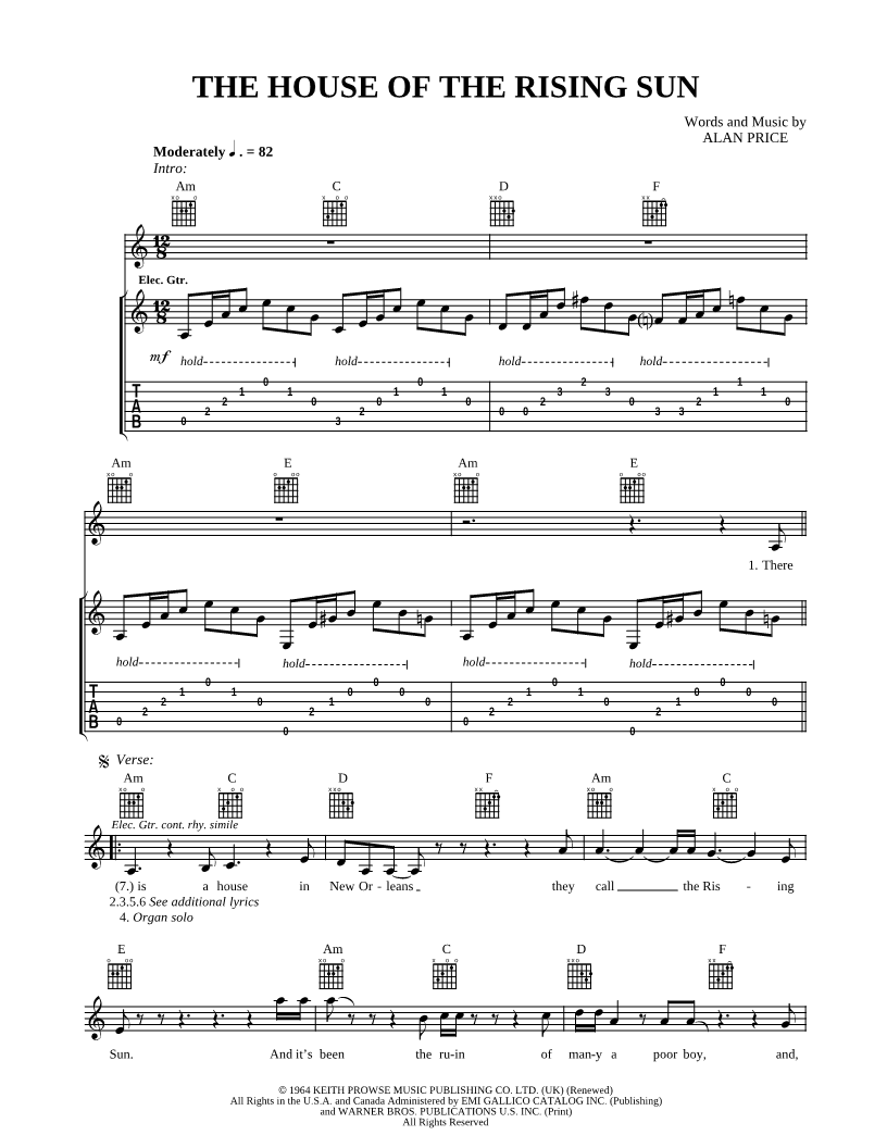 1. The House of the Rising Sun (click here to preview and play this piece) Performers: Composer: Lyricist: Scored For:Guitar TAB and Guitar/Vocal Instruments:Voice and Guitar Number of pages:2 Click here to purchase this piece separately for $5.99 |