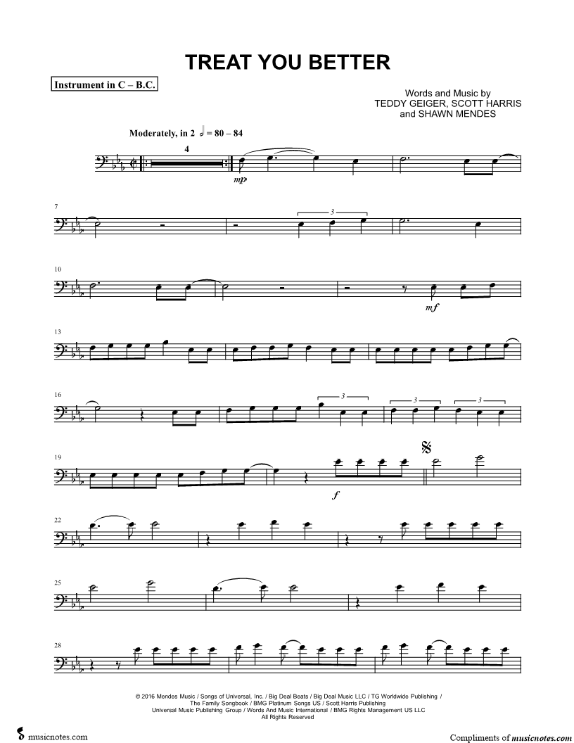 1. Treat You Better - Bass Clef Instrument (click here to preview and play this piece) Performer: Composers: Lyricists: Scored For:Instrumental Part and Instrumental Solo Instruments:Bass Clef Instrument, range: C3-G4, Trombone, Bassoon, Baritone Horn or Euphonium, Cello and Double Bass Number of pages:3 Click here to purchase this piece separately for $4.99 |