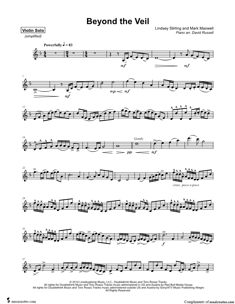 1. Beyond the Veil - Violin Part [Simplified] (click here to preview and play this piece) Performer: Composers: Scored For:Instrumental Solo and Instrumental Part Instrument:Violin, range: A3-F6 Number of pages:2 Click here to purchase this piece separately for $5.99 |