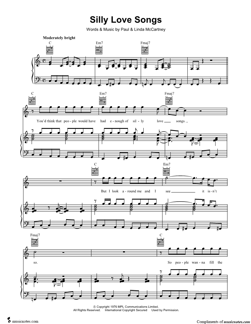 1. Silly Love Songs (click here to preview and play this piece) Performer: Composers: Lyricists: Scored For:Piano/Vocal/Guitar Instruments:Voice, range: C4-A5, Piano, Guitar and Backup Vocals Number of pages:9 Click here to purchase this piece separately for $5.99 |