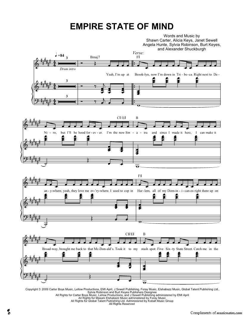 1. Empire State of Mind (click here to preview and play this piece) Performers: Jay-Z and Alicia Keys Composers: Lyricists: Scored For:Piano/Vocal/Chords and Singer Pro Instruments:Voice, range: A#3-C#5 and Piano Number of pages:4 Click here to purchase this piece separately for $5.99 |