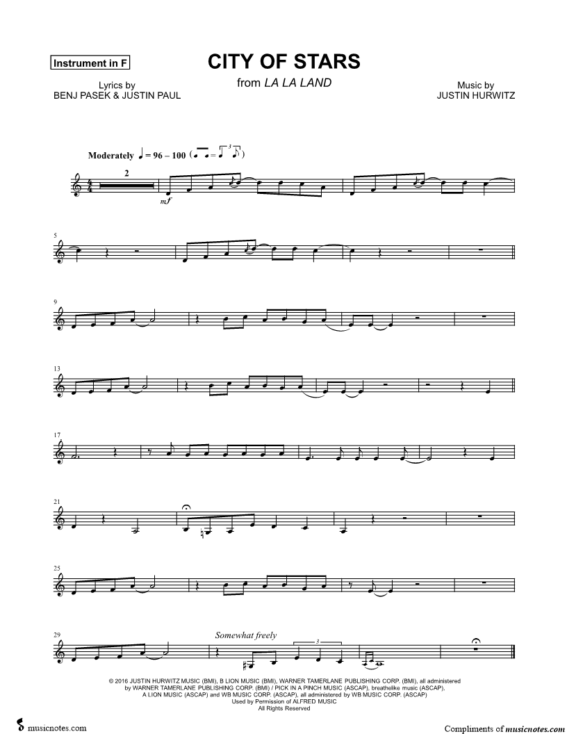 1. City of Stars [Sebastian Solo] - F Instrument (click here to preview and play this piece) Performer: Composer: Lyricists: Scored For:Instrumental Part and Instrumental Solo Instruments:F Instrument, range: G3-D5 and French Horn Number of pages:1 Click here to purchase this piece separately for $4.99 |