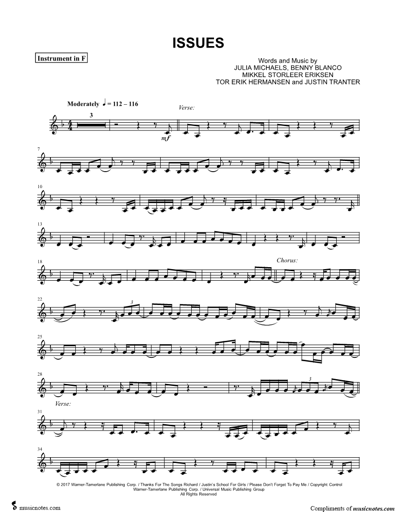 1. Issues - F Instrument (click here to preview and play this piece) Performer: Composers: Lyricists: Scored For:Instrumental Part and Instrumental Solo Instruments:F Instrument, range: A3-F5 and French Horn Number of pages:2 Click here to purchase this piece separately for $4.99 |