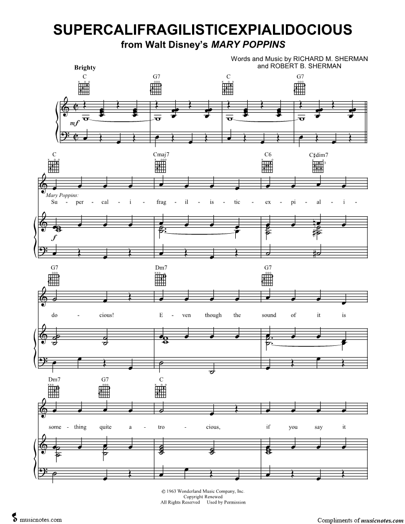 1. Supercalifragilisticexpialidocious (click here to preview and play this piece) Performer: Composers: Lyricists: Scored For:Piano/Vocal/Guitar Instruments:Voice, range: G3-D5, Piano and Guitar Number of pages:5 Click here to purchase this piece separately for $5.99 |