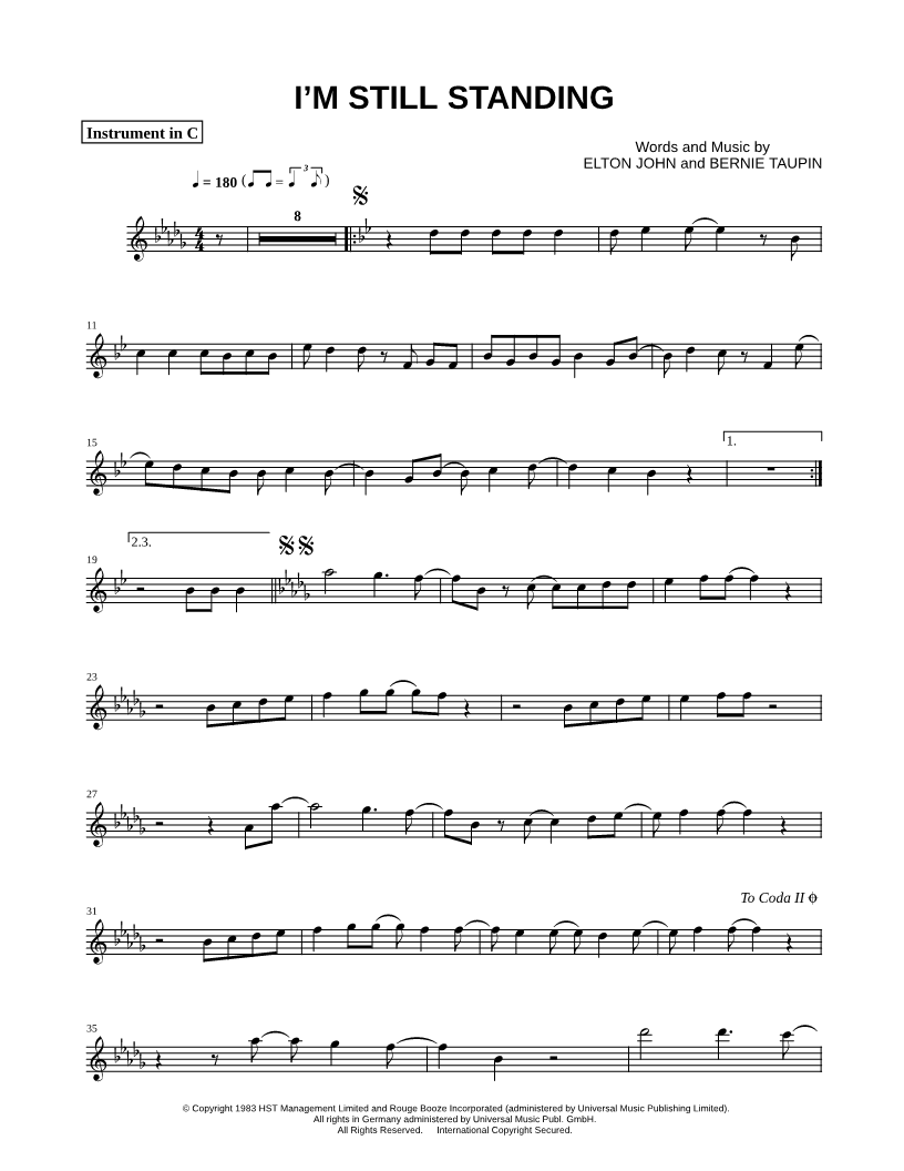1. I'm Still Standing - C Instrument (click here to preview and play this piece) Performer: Composer: Lyricist: Scored For:Instrumental Part and Instrumental Solo Instruments:C Instrument, range: F4-D6, Flute, Violin, Oboe and Recorder Number of pages:2 Click here to purchase this piece separately for $4.99 |