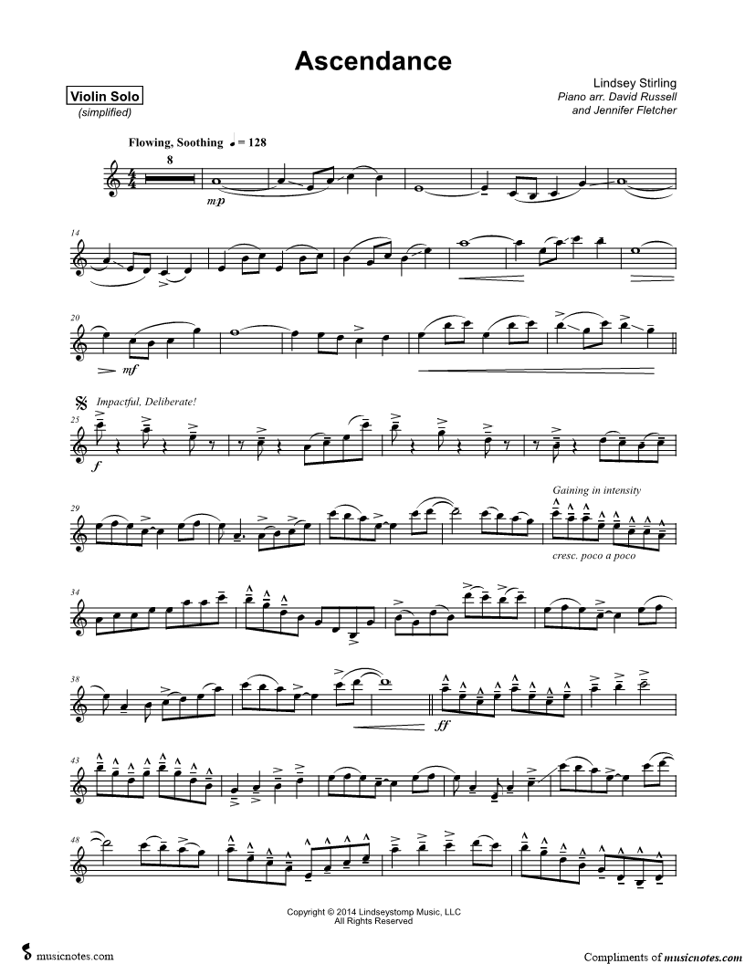 1. Ascendance - Violin Part [Simplified] (click here to preview and play this piece) Performer: Composer: Scored For:Instrumental Part and Instrumental Solo Instrument:Violin, range: G3-D6 Number of pages:2 Click here to purchase this piece separately for $5.99 |