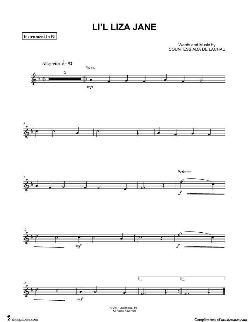 1. Li'l Liza Jane - Bb Instrument (click here to preview and play this piece) Composer: Lyricist: Scored For:Instrumental Solo Instruments:Bb Instrument, range: D4-F5, Soprano Saxophone, Trumpet, Tenor Saxophone and Clarinet Number of pages:1 Click here to purchase this piece separately for $4.99 |