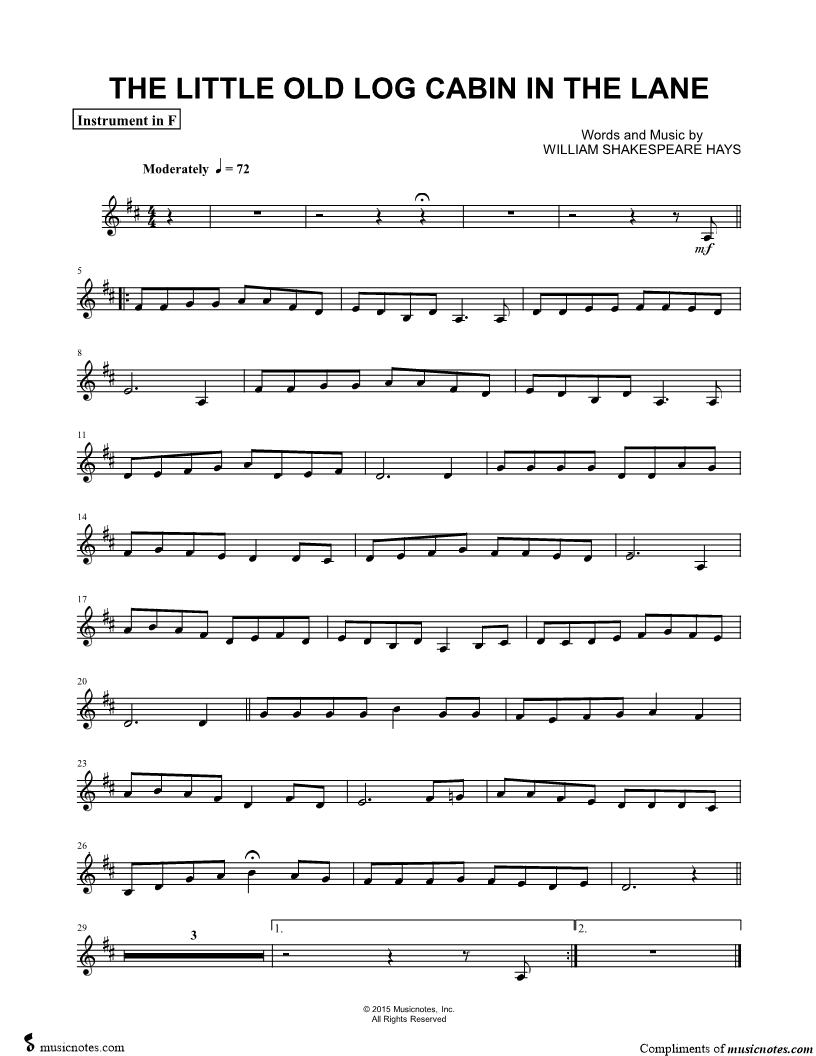 1. The Little Old Log Cabin in the Lane - F Instrument (click here to preview and play this piece) Composer: Lyricist: Scored For:Instrumental Solo and Instrumental Part Instrument:F Instrument, range: A3-B4 Number of pages:1 Click here to purchase this piece separately for $4.99 |