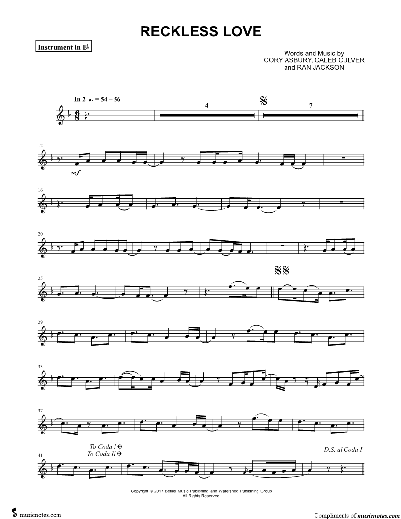 1. Reckless Love - Bb Instrument (click here to preview and play this piece) Performer: Composers: Lyricists: Scored For:Instrumental Solo and Instrumental Part Instruments:Bb Instrument, range: D4-G5, Clarinet, Trumpet, Tenor Saxophone and Soprano Saxophone Number of pages:2 Click here to purchase this piece separately for $4.99 |