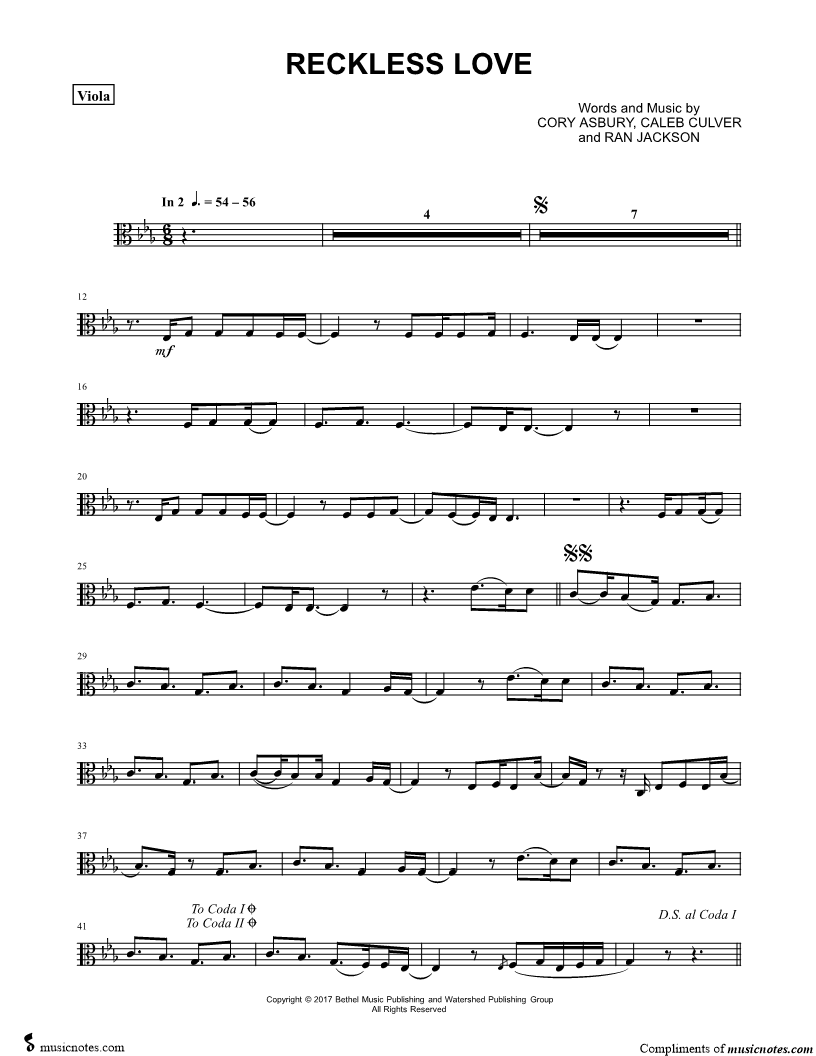 1. Reckless Love - Viola (click here to preview and play this piece) Performer: Composers: Lyricists: Scored For:Instrumental Solo and Instrumental Part Instrument:Viola, range: C3-F4 Number of pages:2 Click here to purchase this piece separately for $4.99 |