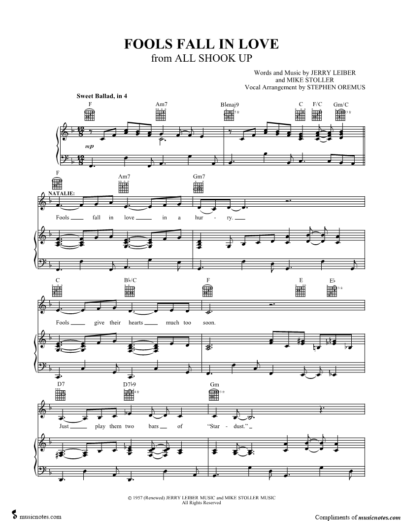 1. Fools Fall in Love (click here to preview and play this piece) Performers: Composers: Lyricists: Scored For:Piano/Vocal/Guitar and Singer Pro Instruments:Voice 1, range: A3-D5, Piano, Guitar, Voice 2, range: A3-D5 or Male Voice, Voice 3, range: A3-D5 or Male Voice, Voice 4, range: A3-D5 or Female Voice and Voice 5, range: A3-D5 or Female Voice Number of pages:7 Click here to purchase this piece separately for $5.99 |