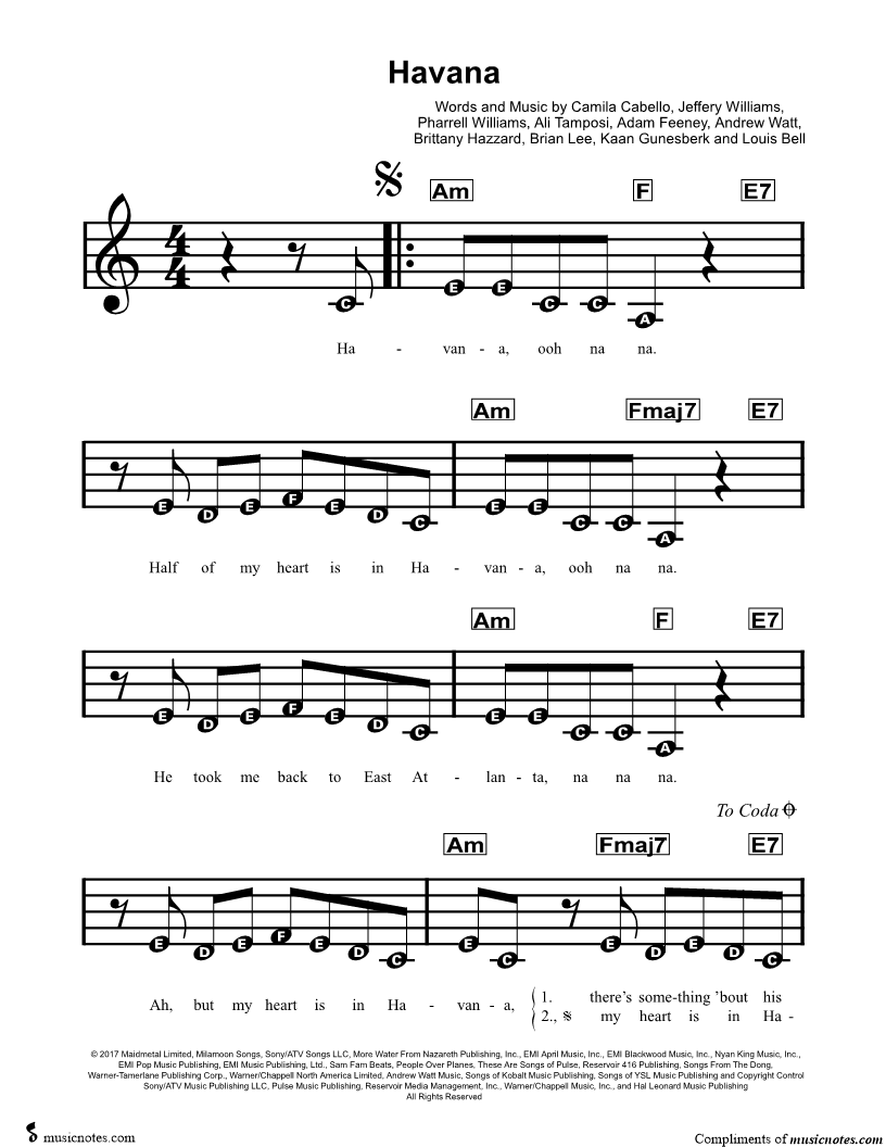 1. Havana (click here to preview and play this piece) Performers: Composers: Lyricists: Scored For:Piano/Vocal/Chords Instruments:Voice, range: A3-A5, Treble Clef Instrument and Piano Number of pages:5 Click here to purchase this piece separately for $4.99 |