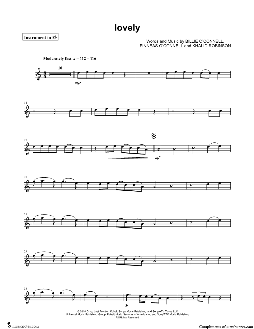 1. lovely - Eb Instrument (click here to preview and play this piece) Performers: Composers: Lyricists: Scored For:Instrumental Part and Instrumental Solo Instruments:Eb Instrument, range: G4-C6, Alto Saxophone and Baritone Saxophone Number of pages:2 Click here to purchase this piece separately for $4.99 |