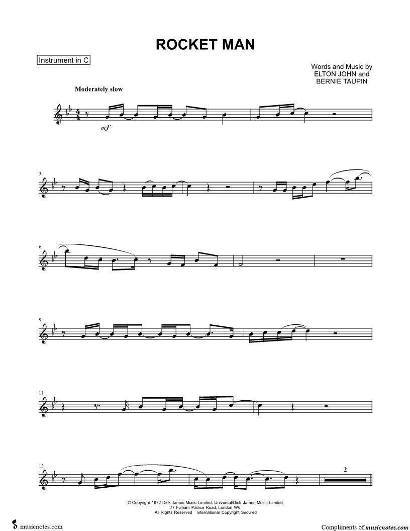 1. Rocket Man - C Instrument (click here to preview and play this piece) Performer: Composer: Lyricist: Scored For:Instrumental Part and Instrumental Solo Instruments:C Instrument, range: F4-Bb5, Flute, Violin, Oboe and Recorder Number of pages:3 Click here to purchase this piece separately for $4.99 |