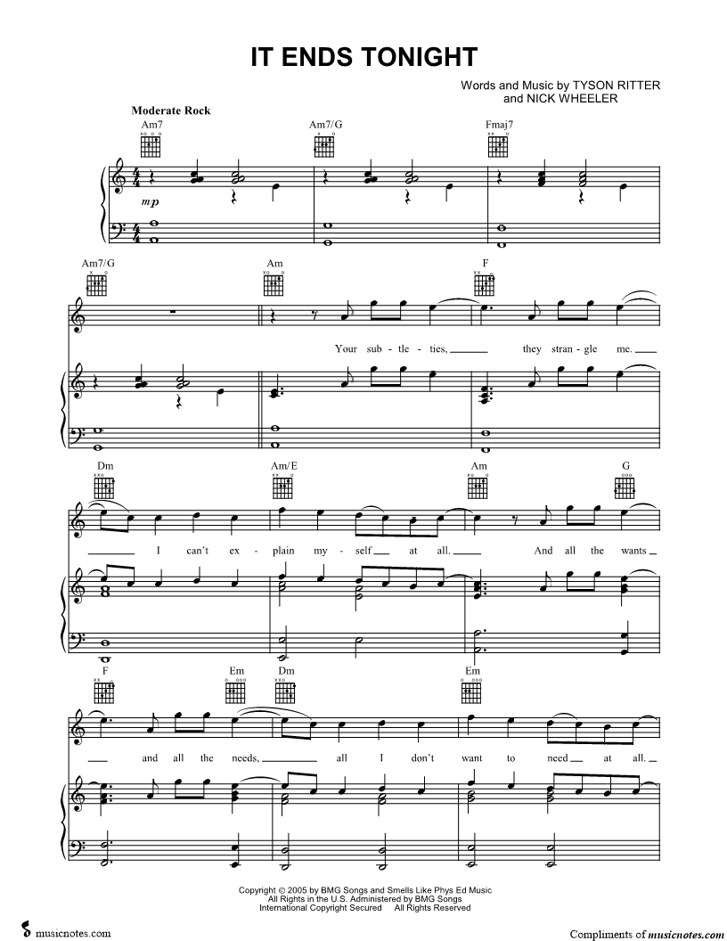 1. It Ends Tonight (click here to preview and play this piece) Performer: Composers: Lyricists: Scored For:Piano/Vocal/Guitar Instruments:Voice, range: G4-C6, Piano and Guitar Number of pages:6 Click here to purchase this piece separately for $5.99 |