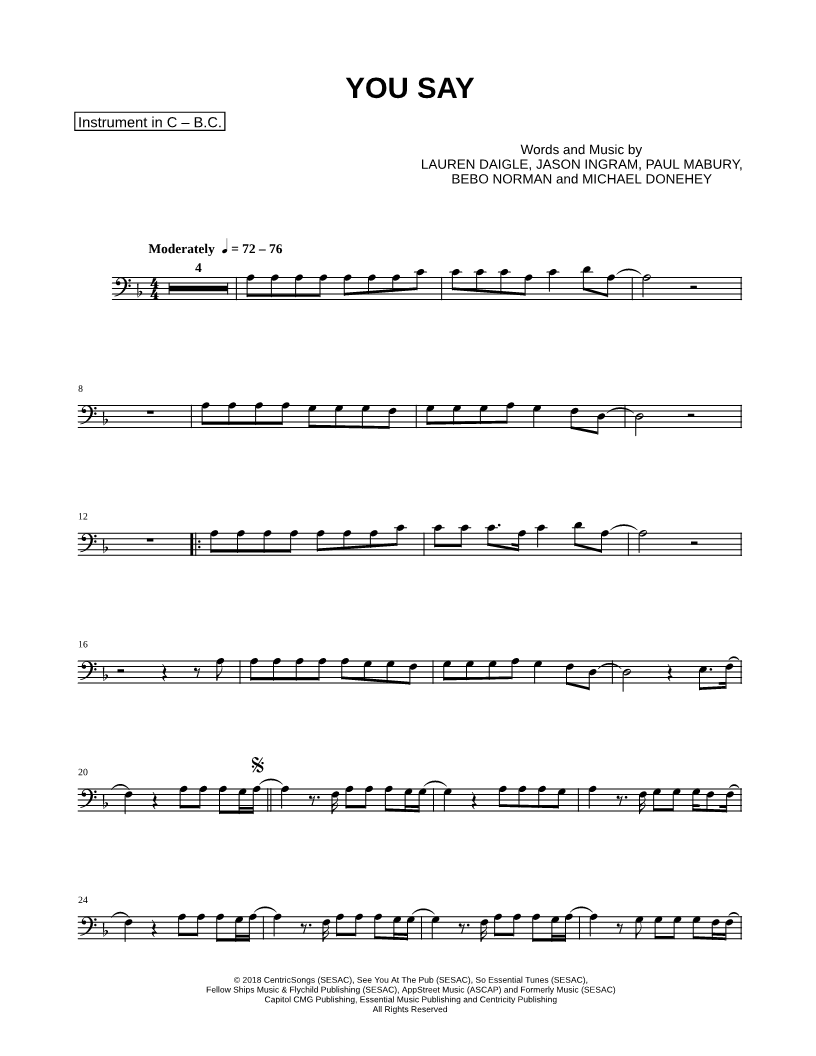 1. You Say - Bass Clef Instrument (click here to preview and play this piece) Performer: Composers: Lyricists: Scored For:Instrumental Part and Instrumental Solo Instruments:Bass Clef Instrument, range: D3-D4, Trombone, Bassoon, Baritone Horn or Euphonium, Cello and Double Bass Number of pages:2 Click here to purchase this piece separately for $4.99 |