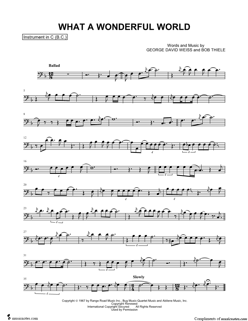 1. What a Wonderful World - Bass Clef Instrument (click here to preview and play this piece) Performer: Composers: Lyricists: Scored For:Instrumental Solo and Instrumental Part Instruments:Bass Clef Instrument, Baritone Horn, Bassoon, Trombone, Cello and Double Bass Number of pages:1 Click here to purchase this piece separately for $4.99 |