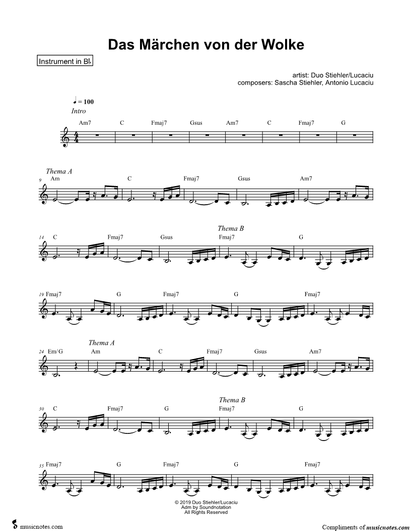 1. Das Märchen von der Wolke - Bb Instrument (click here to preview and play this piece) Performer: Composers: Scored For:Instrumental Solo Instruments:Bb Instrument, range: G3-G5, Trumpet, Clarinet, Soprano Saxophone and Tenor Saxophone Number of pages:2 Click here to purchase this piece separately for $4.99 |