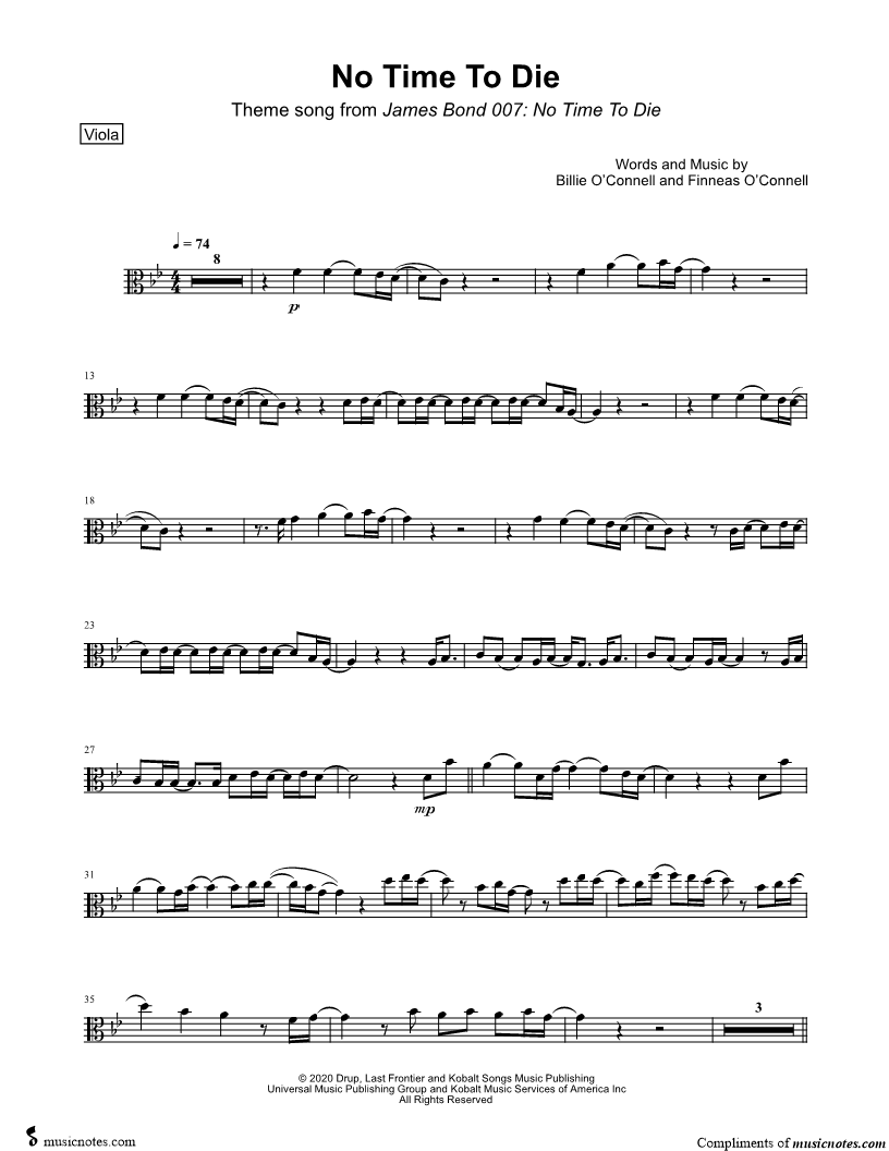 1. No Time to Die - Viola (click here to preview and play this piece) Performer: Composers: Lyricists: Scored For:Instrumental Part and Instrumental Solo Instrument:Viola, range: G3-F5 Number of pages:2 Click here to purchase this piece separately for $4.99 |