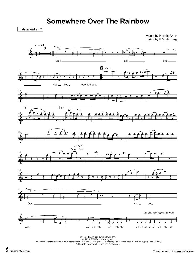 1. Over the Rainbow - C Instrument (click here to preview and play this piece) Performer: Composer: Lyricist: Scored For:Instrumental Solo and Instrumental Part Instruments:C Instrument, range: A4-E6, Flute, Oboe, Recorder and Violin Number of pages:1 Click here to purchase this piece separately for $4.99 |