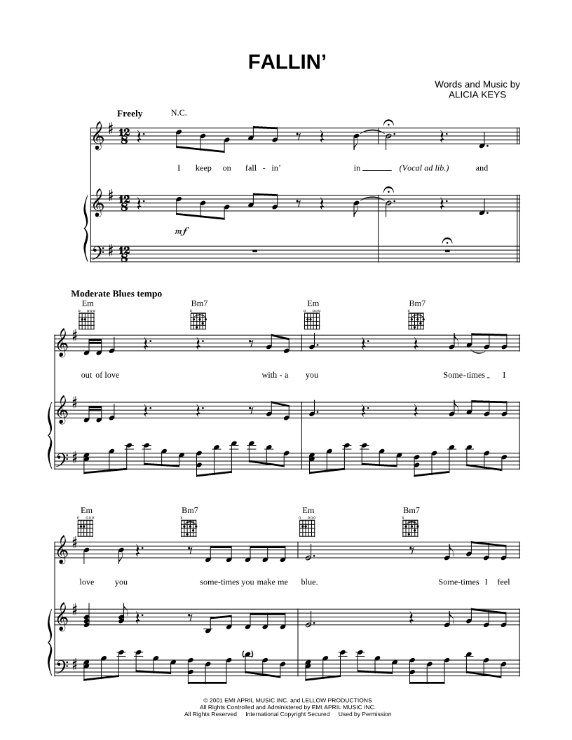 1. Fallin' (click here to preview and play this piece) Performer: Composer: Lyricist: Scored For:Piano/Vocal/Guitar Instruments:Voice, range: B3-E5, Piano and Guitar Number of pages:7 Click here to purchase this piece separately for $5.99 |