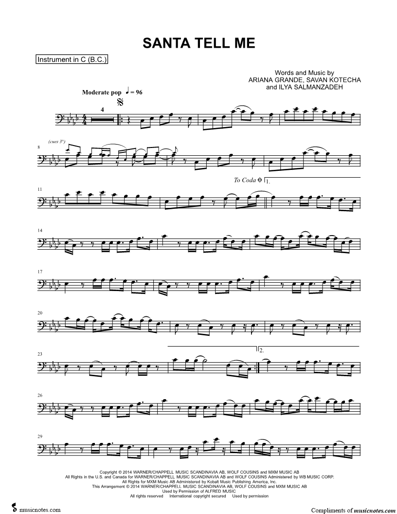 1. Santa Tell Me - Bass Clef Instrument (click here to preview and play this piece) Performer: Composers: Lyricists: Scored For:Instrumental Solo and Instrumental Part Instruments:Bass Clef Instrument, Double Bass, Cello, Baritone Horn, Trombone and Bassoon Number of pages:2 Click here to purchase this piece separately for $4.99 |