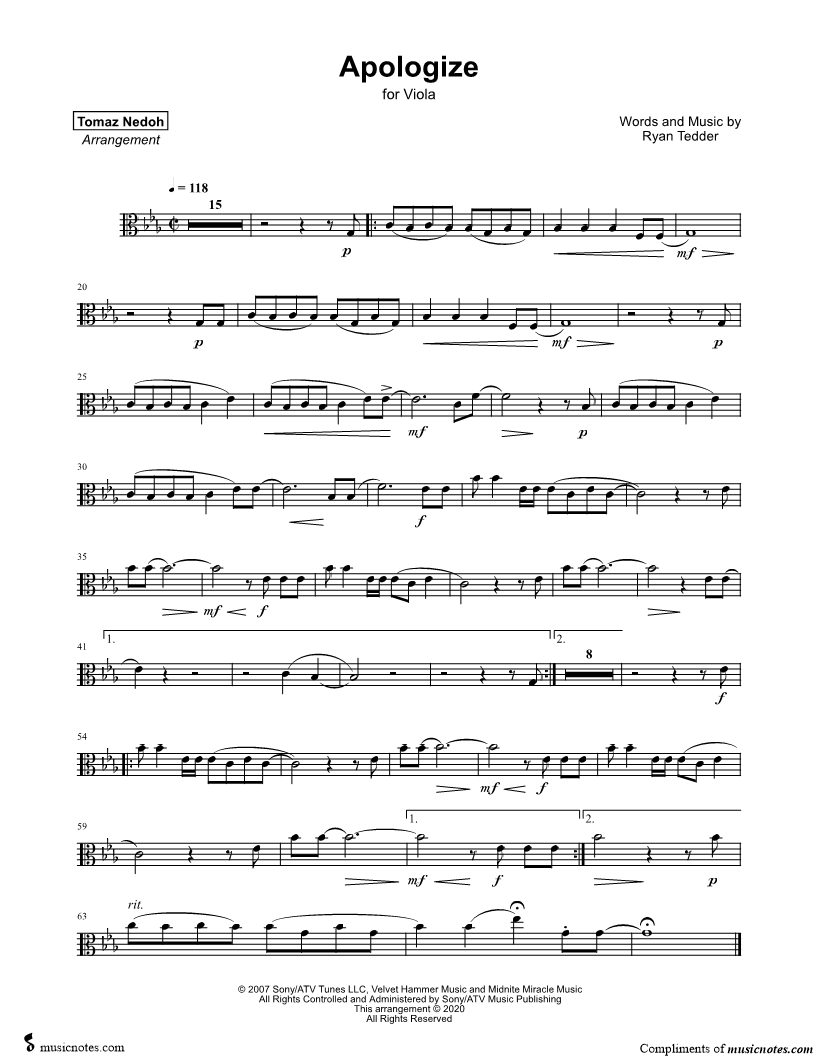 1. Apologize - Viola (click here to preview and play this piece) Performers: Composer: Lyricist: Scored For:Instrumental Solo and Instrumental Part Instrument:Viola, range: F3-Eb5 Number of pages:1 Click here to purchase this piece separately for $2.99 |