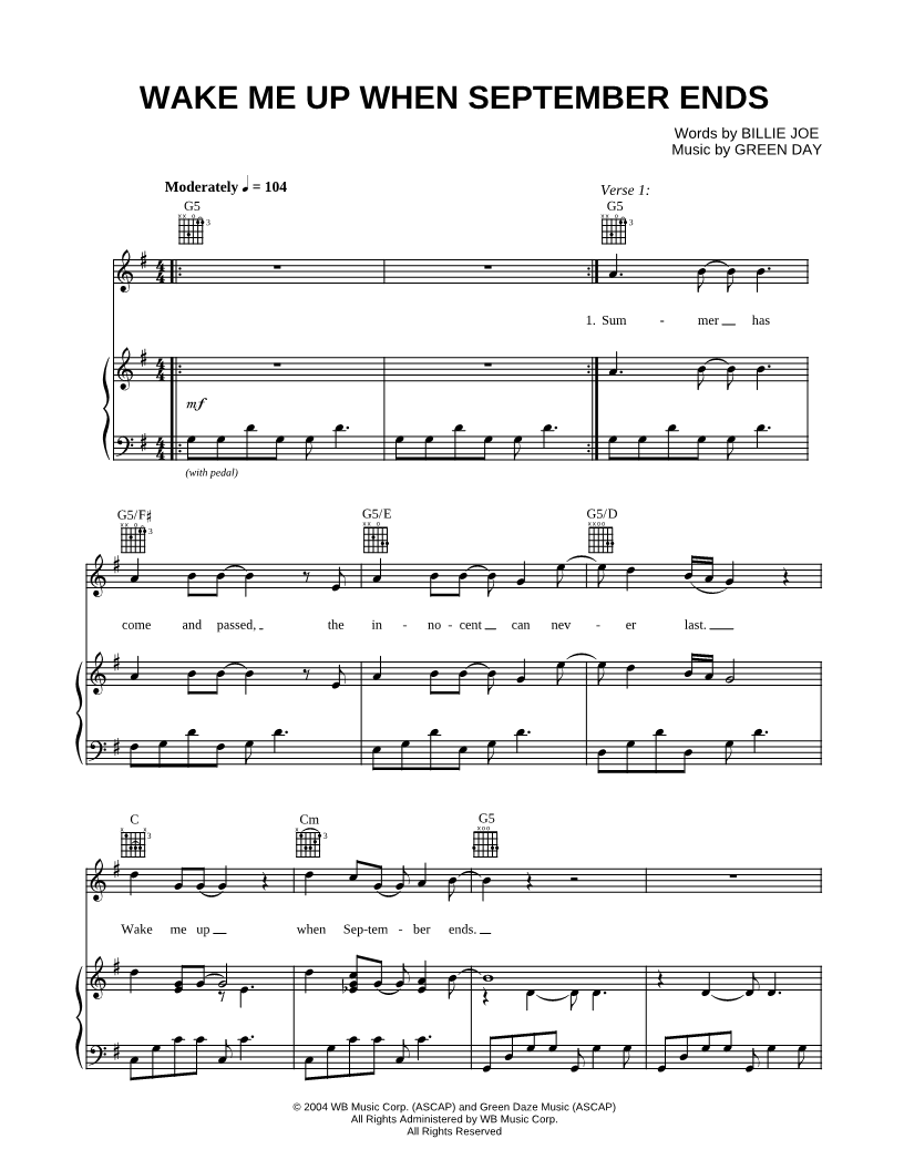 1. Wake Me Up When September Ends (click here to preview and play this piece) Performer: Composer: Lyricist: Scored For:Piano/Vocal/Guitar Instruments:Guitar, Piano and Voice, range: D4-E5 Number of pages:8 Click here to purchase this piece separately for $5.99 |