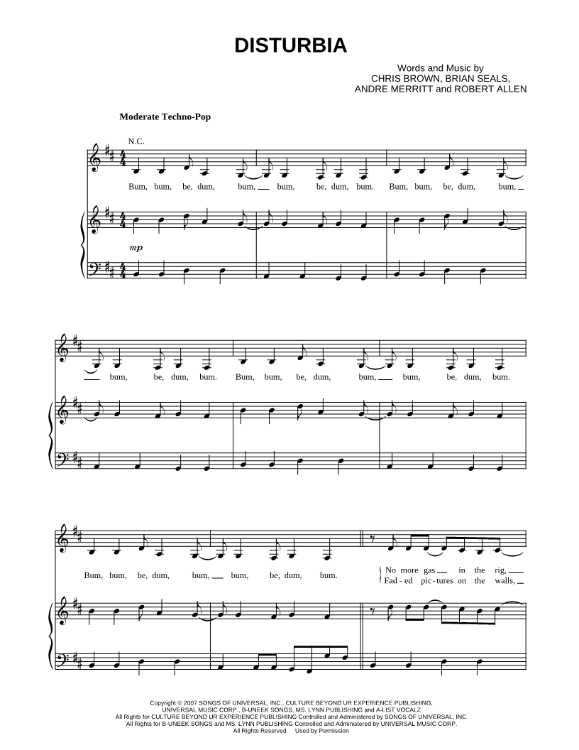 1. Disturbia (click here to preview and play this piece) Performer: Composers: Lyricists: Scored For:Piano/Vocal/Guitar Instruments:Voice, range: F#3-D5, Piano and Guitar Number of pages:6 Click here to purchase this piece separately for $5.99 |